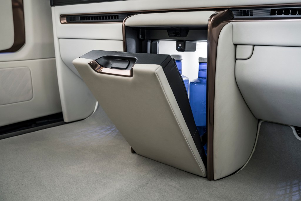 Hay también estaciones de carga personales con función de carga inalámbrica de dispositivos y puertos USB en puntos de almacenamiento que quedan ocultos en los paneles de las puertas. Otros detalles son las luces de lectura, los portavasos iluminados, los espejos de cortesía y los controles de regulación eléctrica de los asientos. También se han instalado unas guanteras individuales a izquierda y derecha de la mampara de separación, a los lados de una nevera en la que caben dos botellas de champán estándar o tres botellas de plástico de medio litro. Además, junto a las puertas correderas, se ha instalado un práctico paragüero.