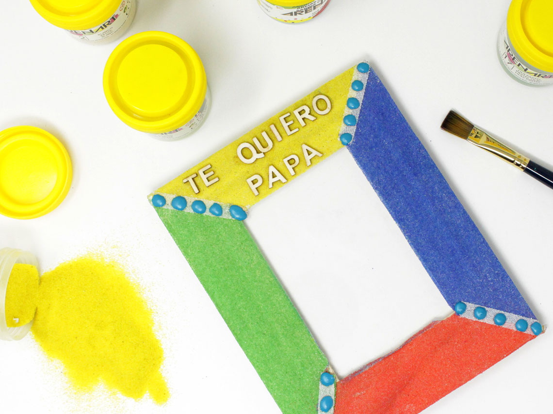 La decoración con arena es una técnica muy original. Igual que ocurre con los lápices para dibujar, hay a nuestra disposición arenas de todos los colores con las que podemos impregnar todo tipo de soportes: papel, utensilios, muebles… En este caso hemos elegido un marco de fotos para papá. Y, además, hemos pegado con letras de madera un mensaje muy especial: Te quiero papá.