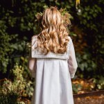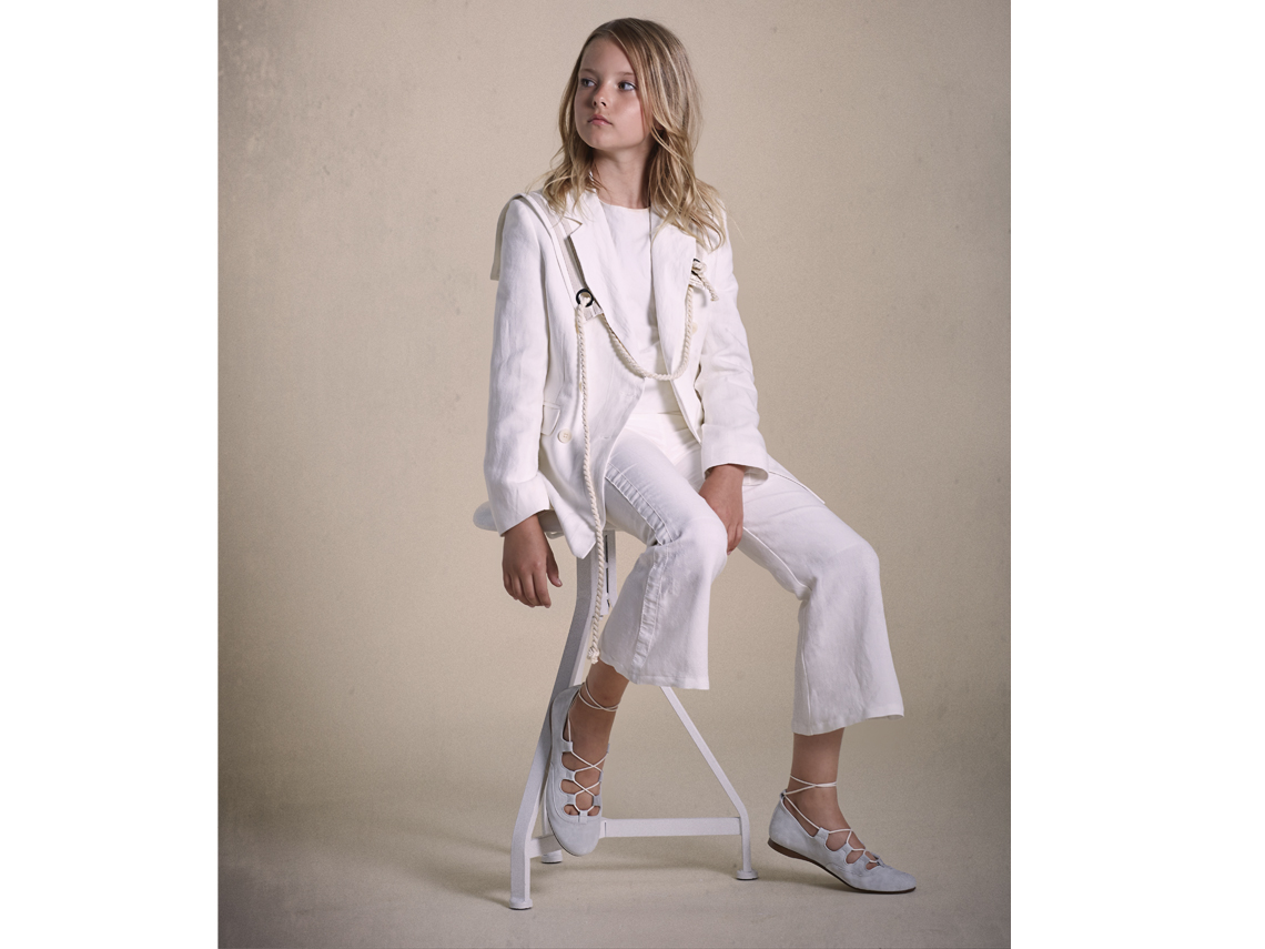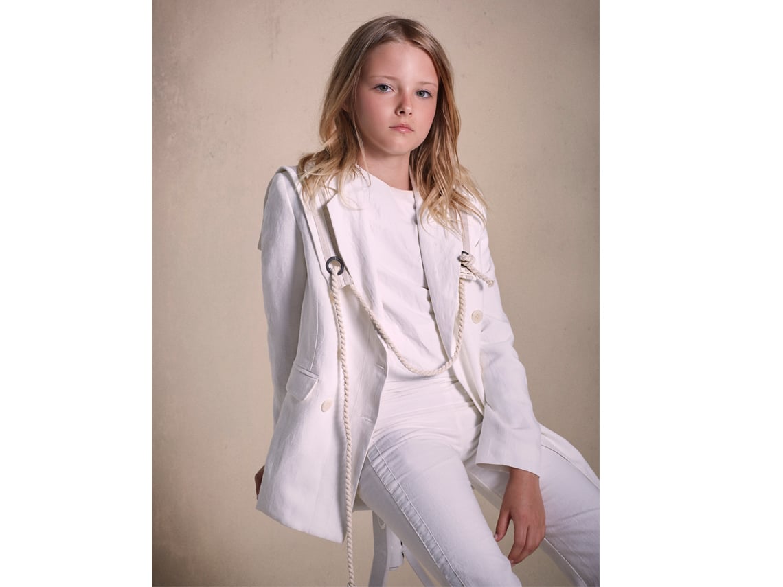 Una de las opciones más rompedoras es la que propone la diseñadora valenciana Hortensia Maeso que propone un traje chaqueta pantalón para ellas con la parte de arriba con cuerda marinera y una babera en la parte de atrás. Perfecto para las niñas que ya no quieren ser princesa.