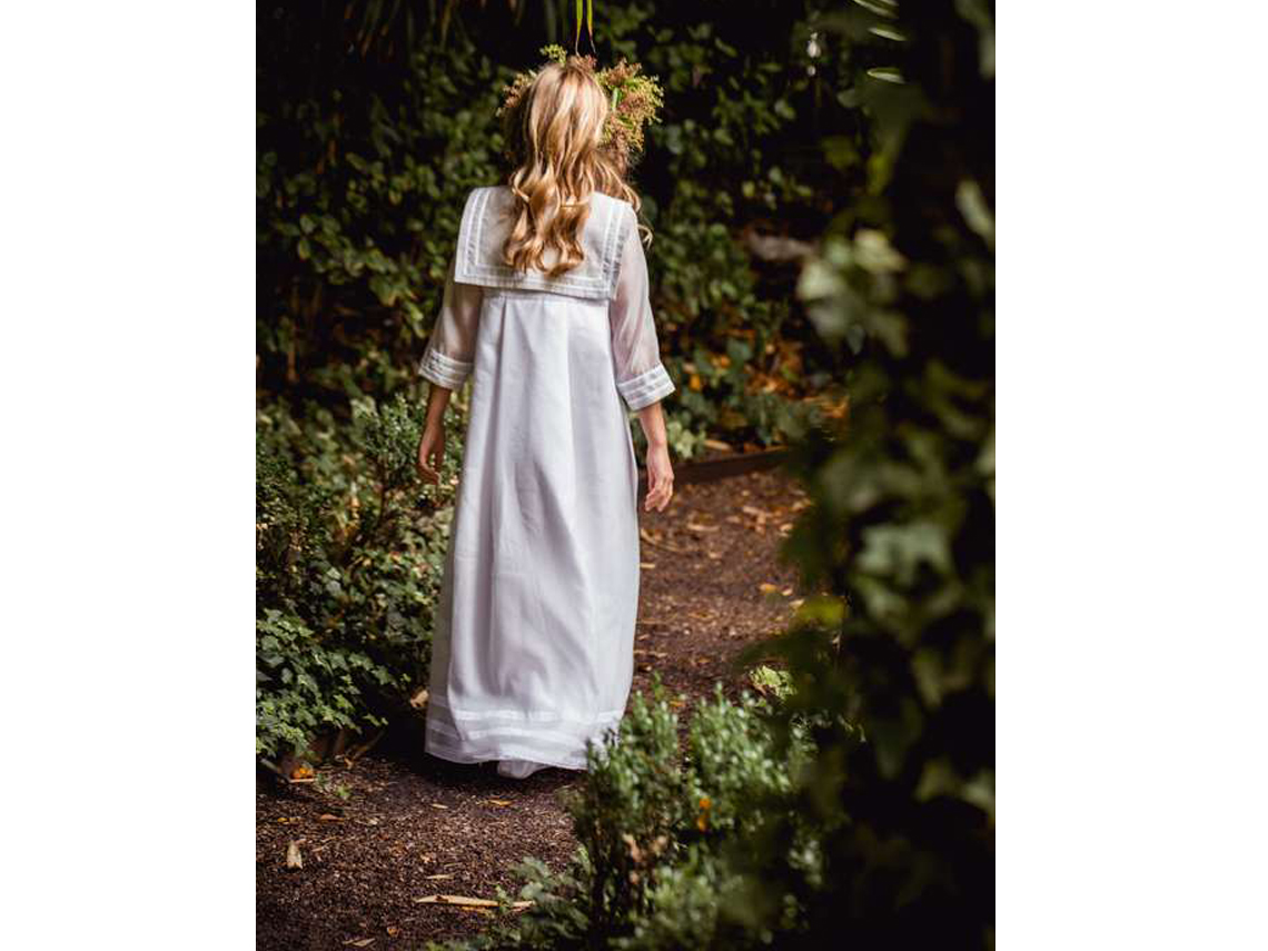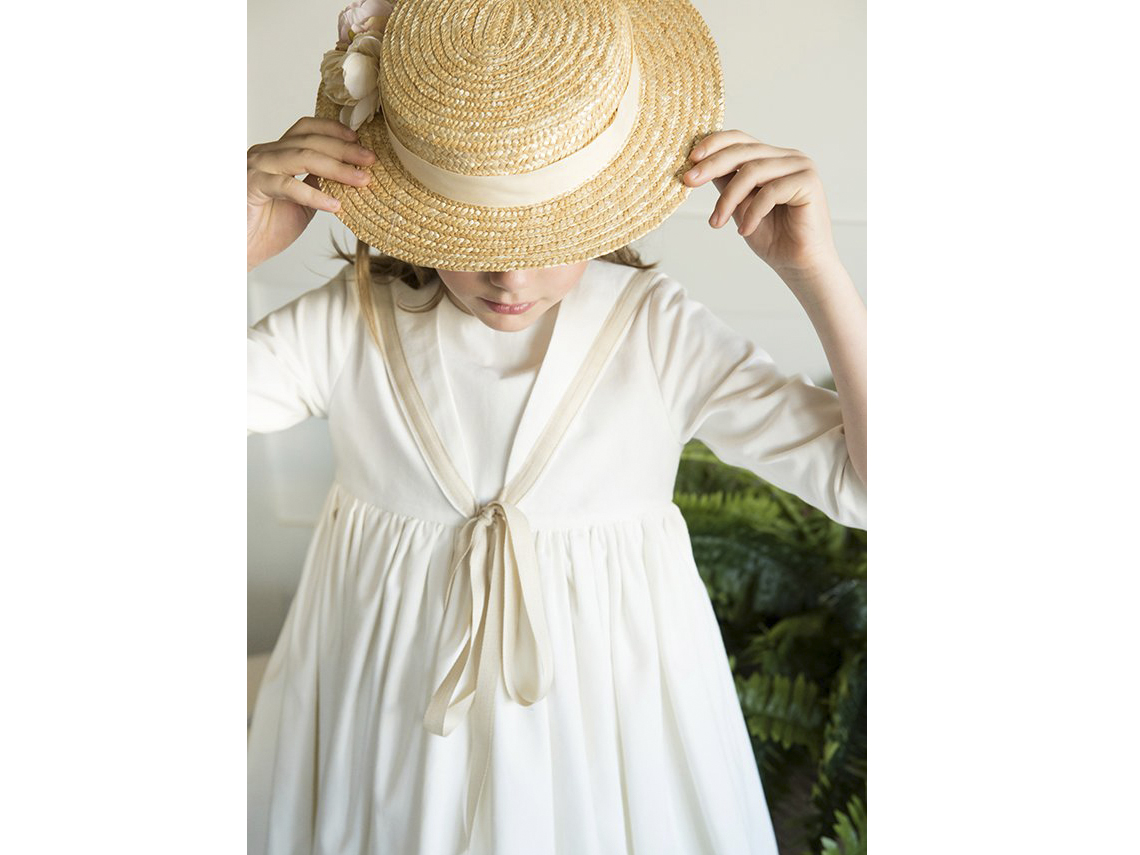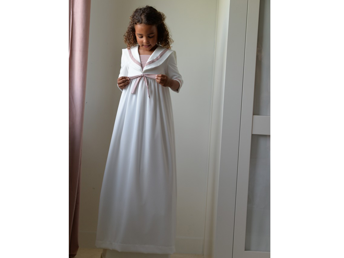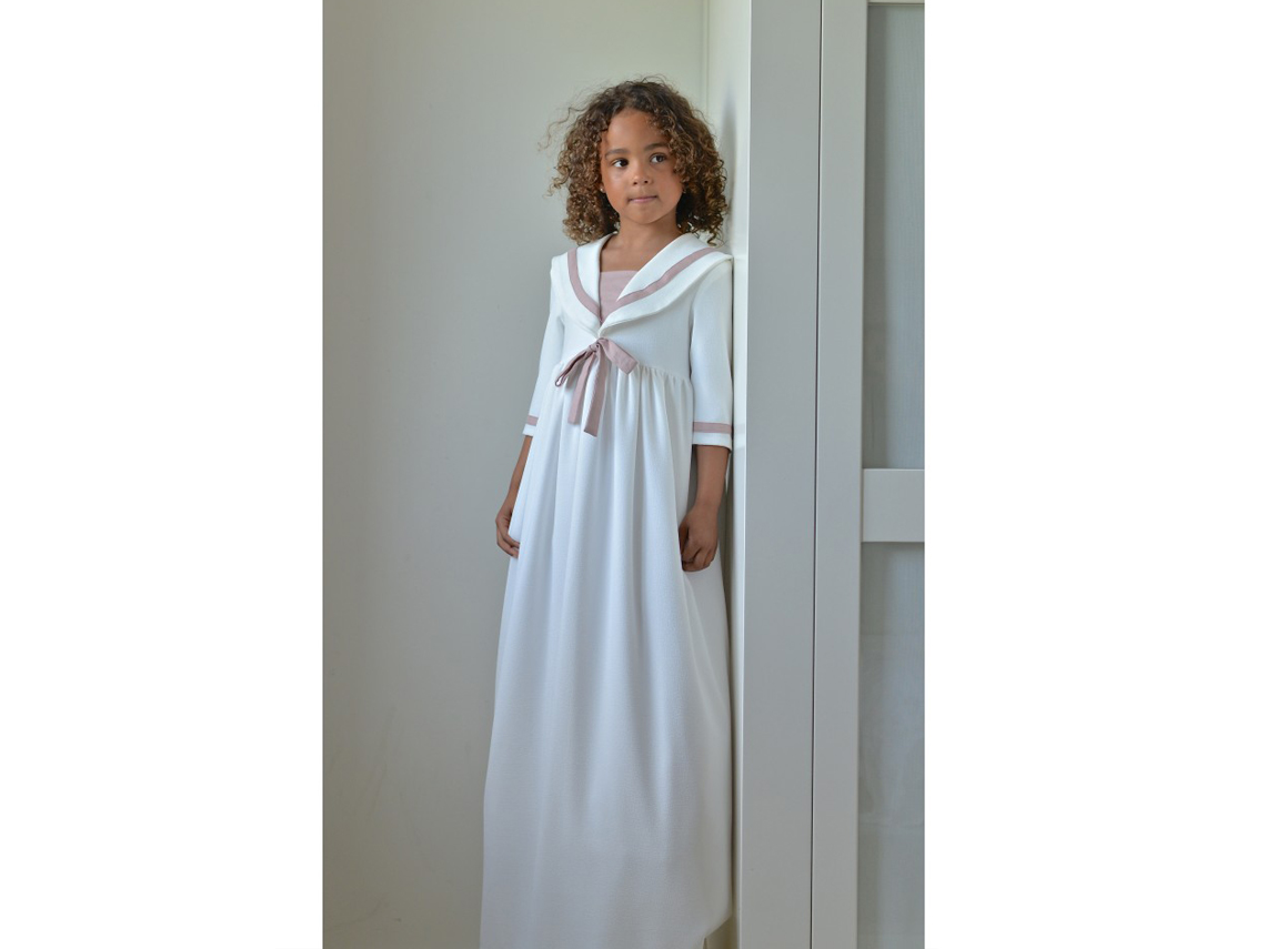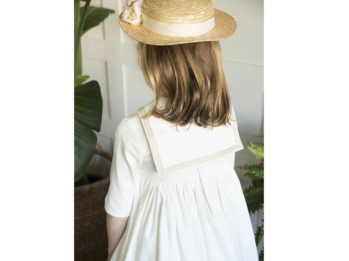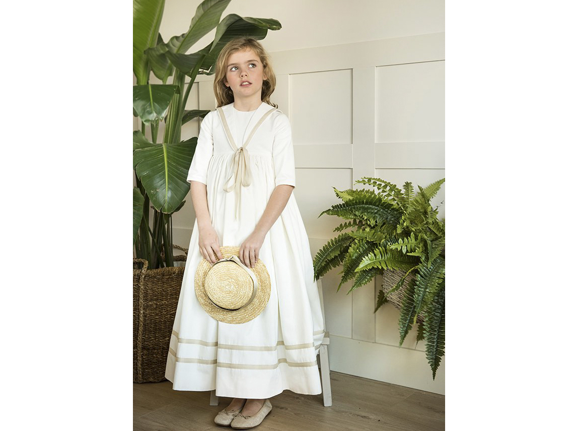 Este traje está confeccionado en creppe color blanco roto y el sobrecuello marinero lleva cinta de trencilla color beige.