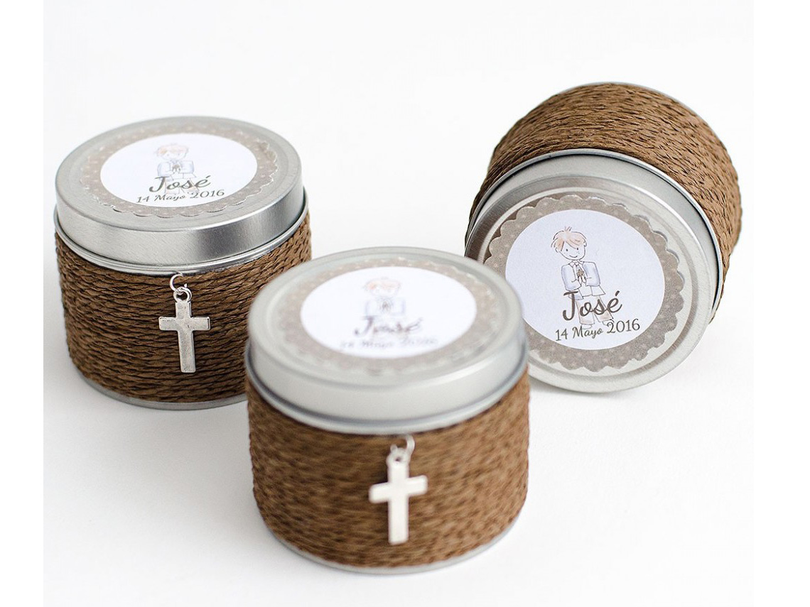 Este set incluye seis velas personalizadas en rafia marrón, un regalo muy original que cada vez que sea encendido recordará a la persona en cuestión que tuvo el gusto de estar presente en el gran día del pequeño. Podréis indicar el nombre del protagonista en el campo de grabación y, después, escoger el modelo de pegatina que más os guste y, por si esto fuera poco, combinar el mismo diseño con los recordatorios. Es de Limonae y el set cuesta 28 euros.