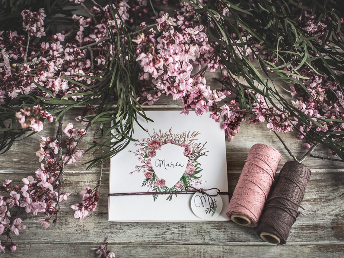 Otra de las tiendas que cuidan prácticamente cada detalle del recuerdo es la papelería Lola y el Caracol Verde que realizan varios productos. Este en concreto es el modelo ‘María’, está realizado en papel Conqueror de alto gramaje, lleva formato tríptico y está disponible para realizar las invitaciones y los sobres a juego. También etiquetas o un espejito con los mismos motivos. En su página web informan de que también realizan el libro de firmas coordinado con el diseño del recordatorio.