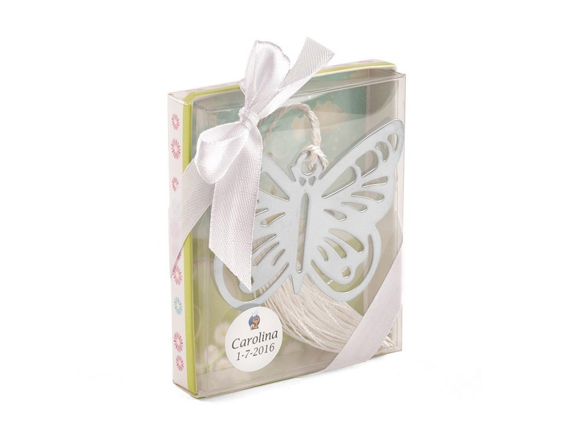 Este no es un marcapáginas al uso: se trata de un punto de libro de metal con forma de mariposa acompañado de una borla de raso en color blanco. Todo se presenta en una caja decorada para la ocasión. Los podrás encontrar en Novo Distribuciones por 0,64 euros cada unidad.