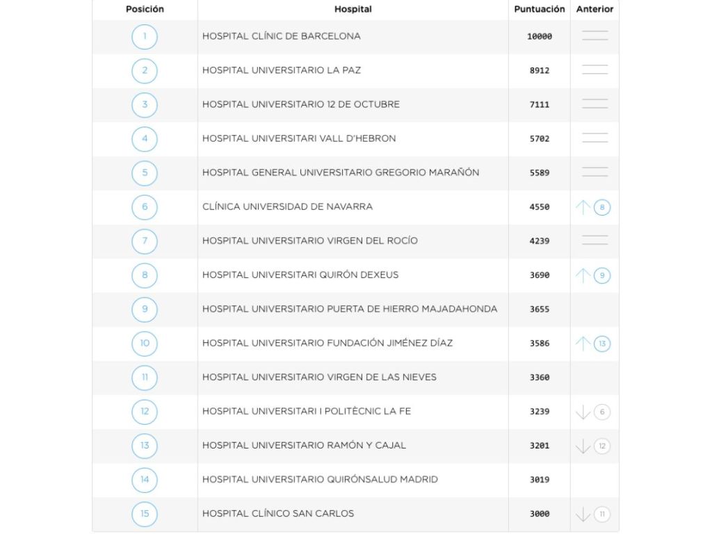 En cuanto al tercer, cuatro y quinto puesto, como decimos, son hospitales públicos de ambas ciudades: el tercero es para el Hospital 12 de Octubre de Madrid, el cuarto para el Vall D’Hebron de Barcelona y el quinto para el Hospital Gregorio Marañón, también de Madrid. Estos puestos no han sufrido variaciones con respecto a la última vez que se publicó el informe, en 2020.