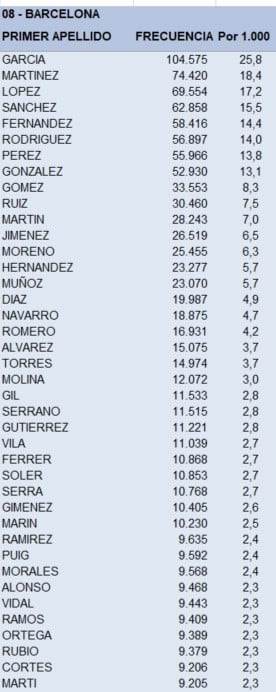 Ya lo era en 2021, cuando según el Instituto Catalán de Estadística (Idescat) había 168.733 personas con dicho apellido en primer lugar, por lo que más de cada 23 habitantes por cada mil lo tenía. En 2022, los datos reafirman el “dominio” de García, que es el apellido más común en las tres provincias de Cataluña según datos recopilados y publicados por el Instituto Nacional de Estadística (INE).