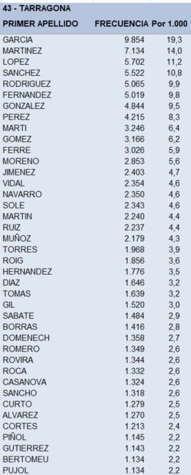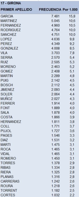 En Barcelona, casi 105.000 personas se apellidan García en primer lugar, mientras que en Girona hay casi 7.500 por las casi 10.000 que lo tienen en Tarragona. La diferencia con respecto al segundo apellido es especialmente significativa en la provincia de Barcelona, donde Martínez, el segundo más común, lo tienen de primer apellido 74.420 personas, a 30.000 de distancia de García. Más ajustadas son las diferencias en las otras dos provincias catalanas.