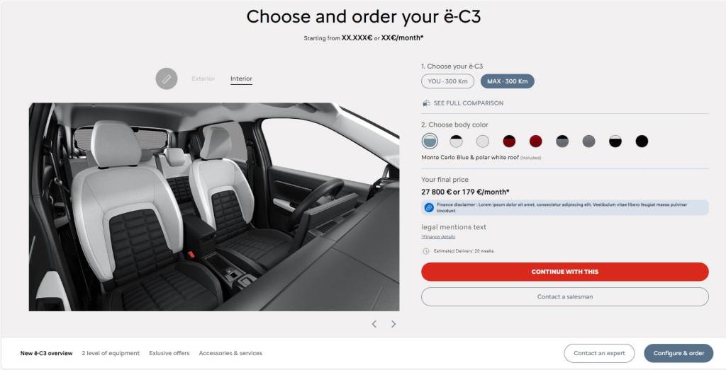 Esta evolución, aplicable en smartphones, tabletas y ordenadores, se aplica al ëC3, cuyos pedidos están ya abiertos en la mayoría de los mercados europeos, y se desplegará progresivamente en otros modelos. Diseñado para ser fácil y amigable, este nuevo portal ofrece una plataforma intuitiva que permite a los usuarios informarse y comprar su coche Citroën de una manera más simple y eficiente en sólo 3 clics. Así, la nueva estructura pretende aportar más simplicidad haciendo que toda la información sea inmediatamente accesible y mostrándola con más claridad y transparencia.