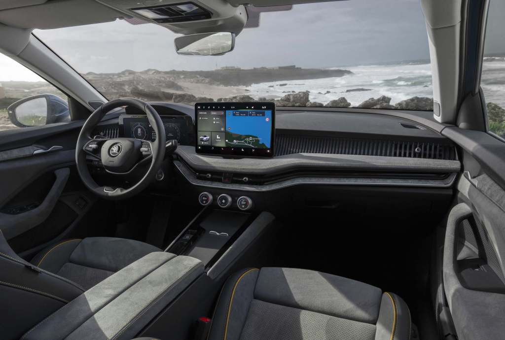 El interior del Superb Combi familiar incluye una pantalla de infoentretenimiento independiente de hasta 13 pulgadas y una consola central ordenada, ya que la palanca selectora se ha desplazado a la columna de dirección. Por primera vez, se ofrece como opción un Head-up Display. Los Smart Dials de Škoda y el asistente de voz Laura, que pronto se complementará con ChatGPT, facilitan el control de numerosas funciones del vehículo y de infoentretenimiento, proporcionando información que va más allá del ecosistema del coche.
