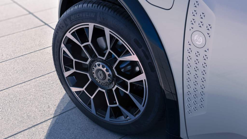 En el exterior, Renault 5 E-Tech 100% eléctrico Roland-Garros destaca por su elegancia y deportividad. Para esta serie especial se ofrecen cuatro colores: blanco nacarado, azul noche, negro estrellado y gris pizarra satinado en exclusiva. Estos colores combinan perfectamente con las molduras del techo con acabado cromo satinado y sus llantas de 18 pulgadas diamantadas de color negro brillante. Las llantas se benefician de un diseño específico y están decoradas con un embellecedor central gris mate que les aporta un toque de elegancia deportiva.