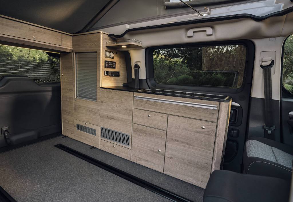 Su cocina, que incluye un fregadero y 2 placas de gas, un frigorífico de 16 litros y una mesa retráctil, permite que 4 personas disfruten de una buena comida en el interior, gracias a los asientos delanteros giratorios hacia la zona de estar. Las 2 puertas laterales correderas (eléctricas en opción) también permiten cocinar desde el exterior y comer al aire libre en los días soleados, gracias a la mesa plegable que puede instalarse en la parte trasera de la cocina. Y si el sol insiste demasiado, el Citroën Holidays está equipado con una barandilla lateral a cada lado, que permite instalar un toldo enrollable (disponible como accesorio). El mueble de cocina es desmontable para poder cocinar al aire libre.
