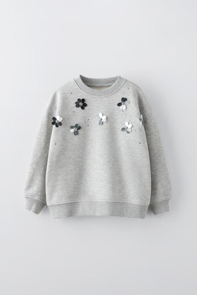 Sudadera con cuello redondo y manga larga, tiene acabados en rib y apliques de flores 3D en el delantero. En su producción lleva un 49% de poliéster reciclado con certificado RCS fabricado principalmente a partir de residuos de plástico PET.