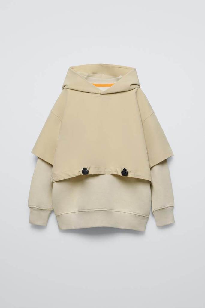 Sudadera con cuello redondo y manga larga acabada en puño. Calidad interior cálida y suave. Camiseta en superposición con capucha y manga corta. Aplique con stoppers ajustables en delantero. Estampado de texto en la espalda.