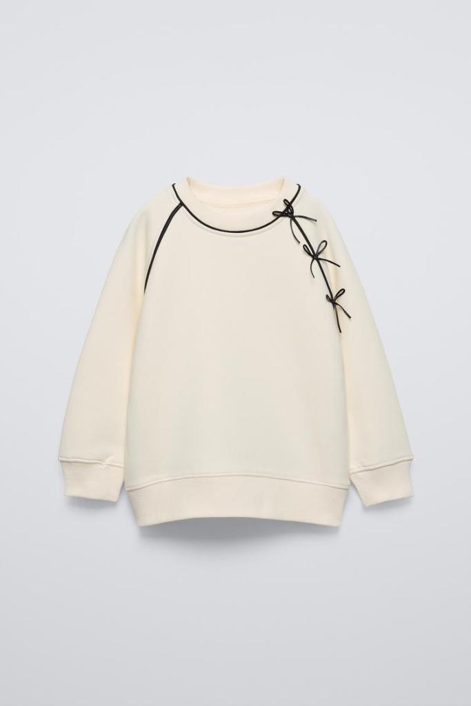 Sudadera con cuello redondo y manga larga en tono crudo. Acabados en rib. Lleva detalle de vivos a contraste y aplique lacitos en el lateral de la pechera. Calidad interior cálida y suave.
