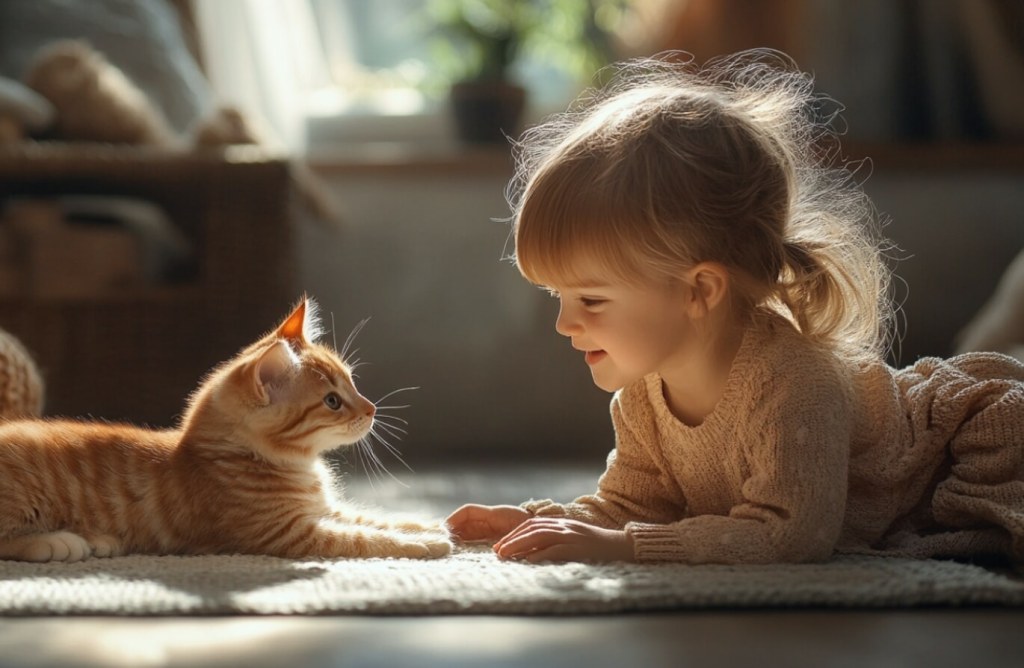 Una niña jugando con su gato en el suelo de su habitación. - Imagen: PF