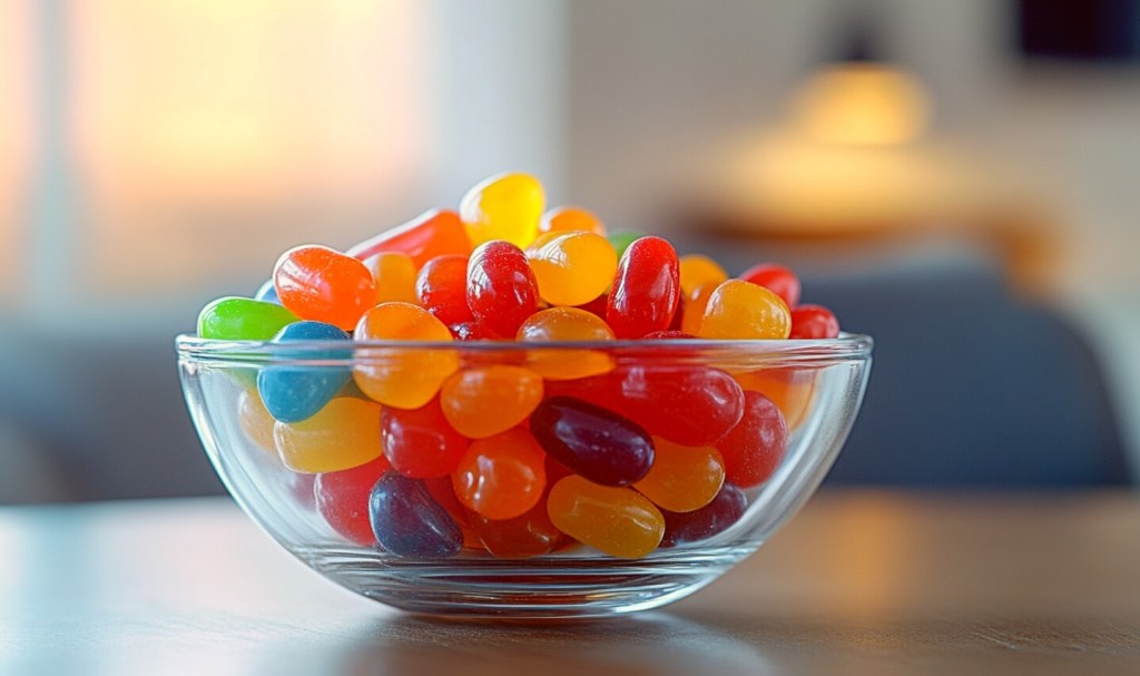 Un cuenco de cristal lleno de caramelos de colores encima de la mesa. - Imagen: PF