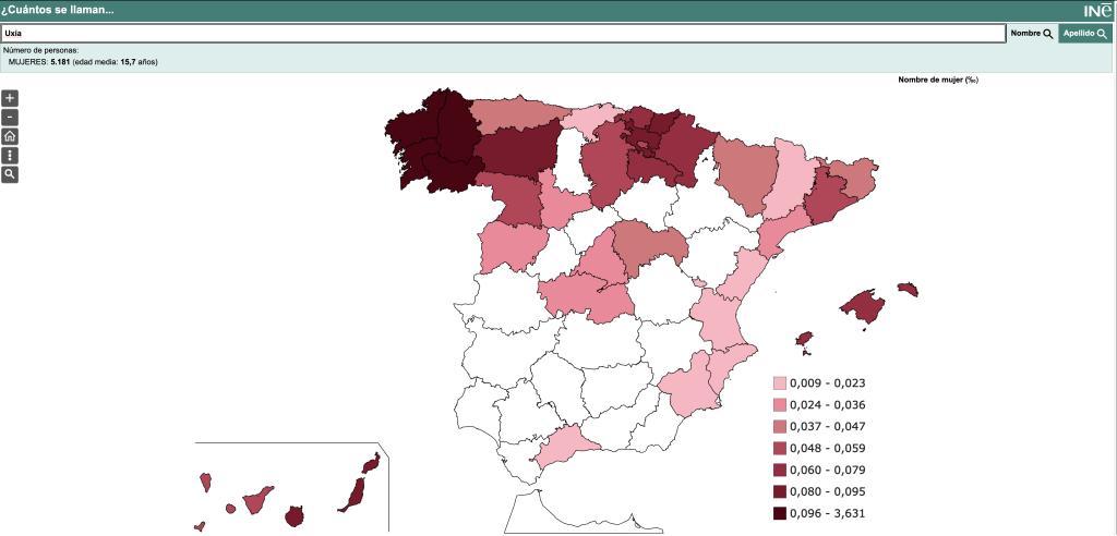 De acuerdo con el Instituto Nacional de Estadística, 5.181 de mujeres en España llevan este nombre, con una media de edad de 15,7 años. Su uso es especialmente notable en Galicia, con una concentración mayor en Pontevedra, Ourense, Lugo y A Coruña. Sin embargo, Uxía también ha comenzado a aparecer en otras comunidades autónomas, como Castilla y León, el País Vasco, Baleares, Cataluña e incluso Madrid, lo que indica su creciente aceptación fuera de su territorio de origen.