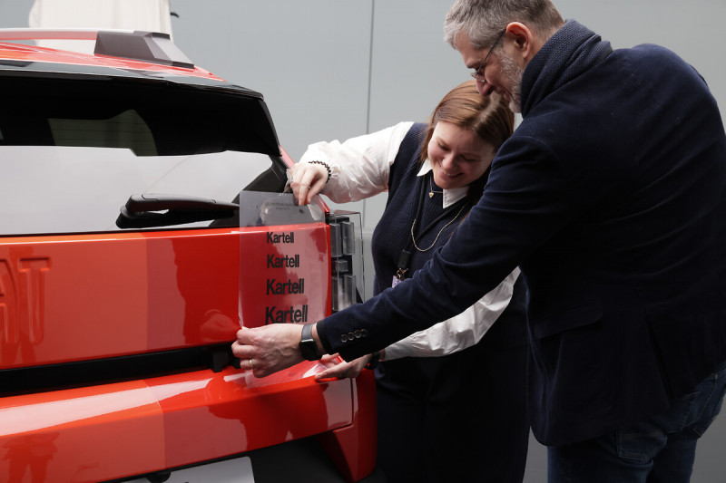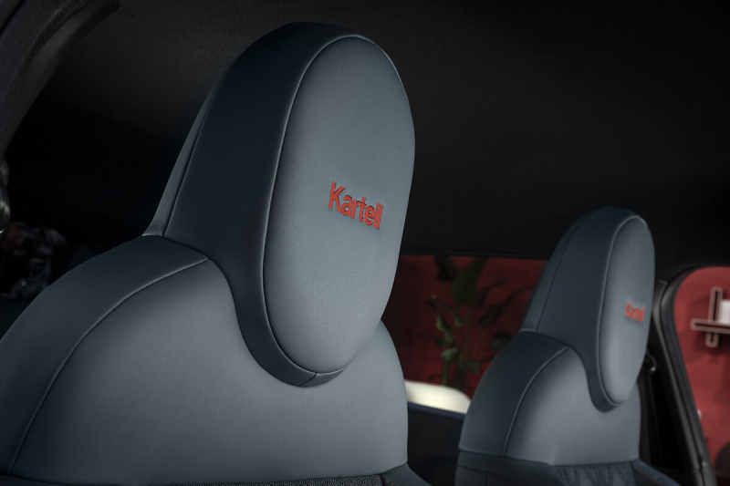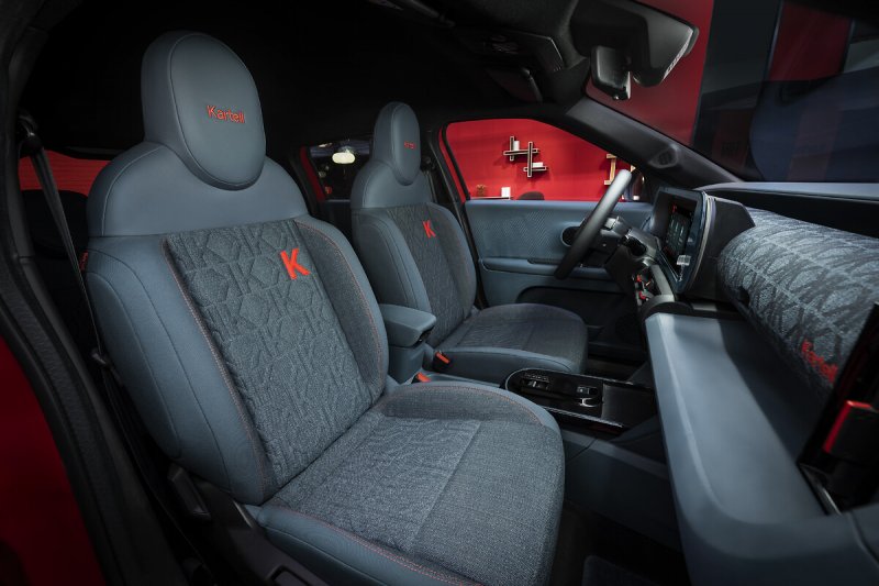 Pero hay más: los detalles hablan. El logotipo de Kartell aparece reinterpretado como un elemento decorativo tanto en las llantas, como en el tercer pilar del vehículo y en el interior. Allí, el monograma "kk" se termograba delicadamente sobre los asientos, aportando textura y un guiño táctil que hará las delicias de quienes disfrutan del diseño en cada rincón. La tapicería, elaborada en lona Pop mélange, es moderna y resistente, pero también suave y cálida: ideal para acompañar a pequeños aventureros en cada trayecto.