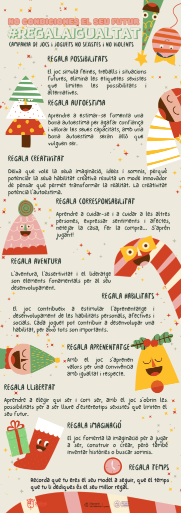 Bajo el lema "No condiciones su futuro, #regalaigualdad", el Ayuntamiento de Xàtiva pone a disposición de las familias un decálogo digital. Ofrece orientaciones claras para evitar comportamientos sexistas al momento de elegir los tradicionales regalos navideños. Este decálogo propone regalos que fomenten posibilidades como la creatividad, la autoestima, la libertad y el pensamiento crítico. Además, aboga por el desarrollo de competencias como la corresponsabilidad y la cooperación, en lugar de reforzar la competitividad o la violencia.