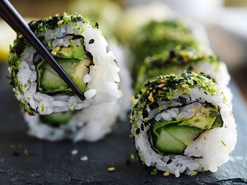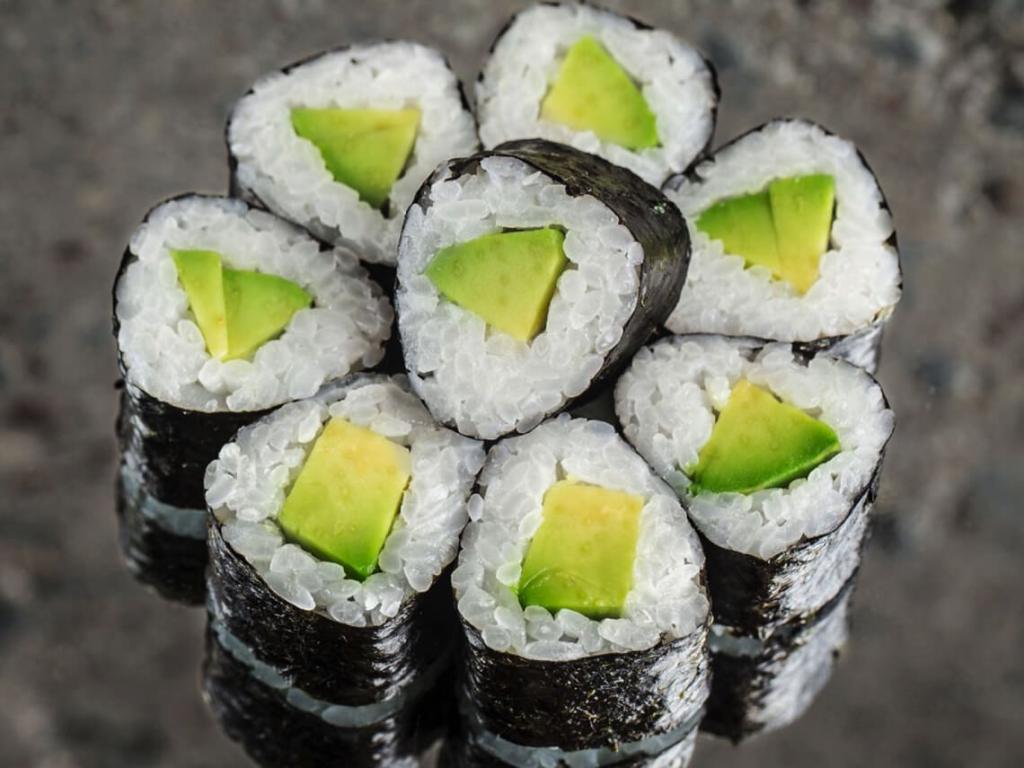 También otras variedades de deliciosos rollos de sushi, como por ejemplo las variedades maki elaboradas con alga nori, arroz, algún vegetal (como el aguacate), y marisco cocinado. Por ello, los rollos vegetarianos o veganos son ideales durante la gestación, ya que suelen contener pepino, aguacate y setas.