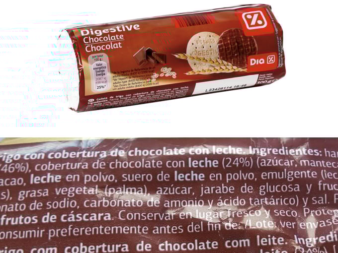 Las galletas Digestive con chocolate de los supermercados DIA están elaboradas con grasa vegetal de palma.