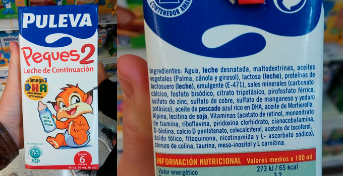 La leche de continuación Peques 2 de Puleva lleva entre sus aceites vegetales, el aceite de palma.Según la Asociación Española de Pediatría, "en los últimos años, la mayoría de las fórmulas infantiles han aumentado el contenido en β-palmitato, para acercarse a los valores presentes en la leche humana. Con esta disposición se favorece la absorción de ácidos grasos, pero también de calcio y se favorece el desarrollo de una microflora rica en bifidobacterias. También se ha demostrado en un modelo animal el efecto anti-inflamatorio del β-palmitato sobre la mucosa intestinal."