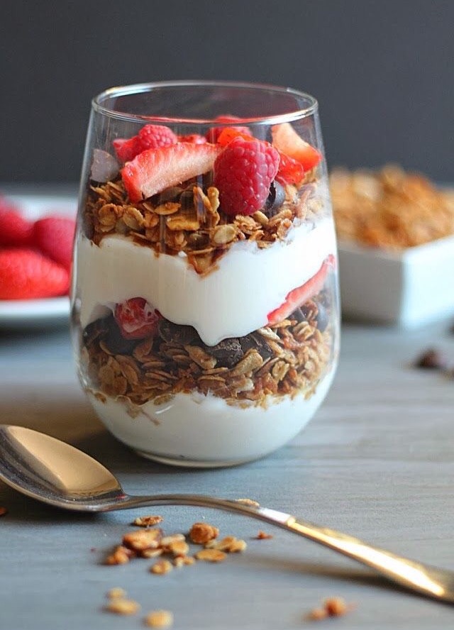 El yogur griego tiene el doble de proteínas que el tradicional, así como calcio, vitaminas A y B12, y potasio. Puedes endulzarlo y espolvorear una cucharada de semillas de chía o cinco almendras fileteadas.