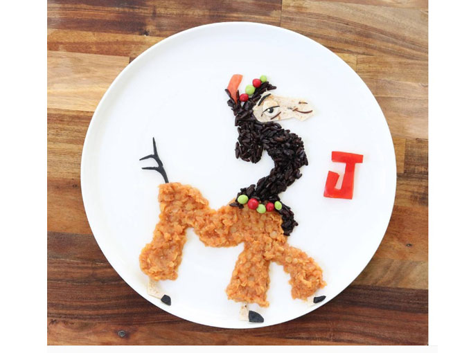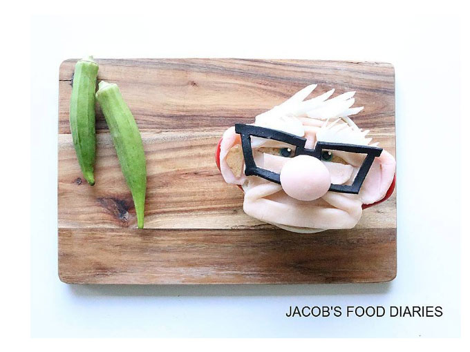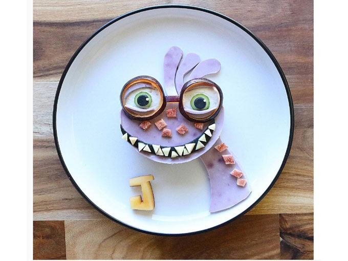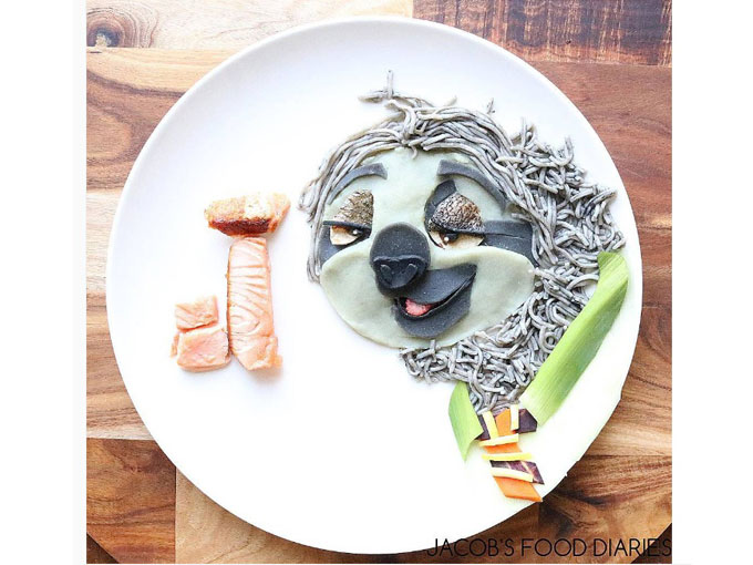 Una sana comida con pastel de patata, un poco de carne con aromas de hierbas y rociado con aceite de coco antes de meter en el horno. Terminamos con un poco de col rizada para el pelo y algas Nori para las gafas.