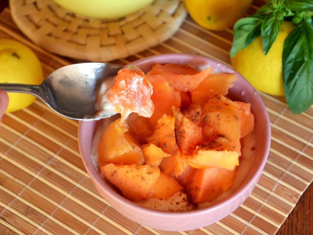 Finalmente, agitamos el yogur natural y lo vertemos en un tazón pequeño. Añadimos la papaya cortada a trozos y mezclamos bien. Si lo deseas, puedes espolvorear un poco de canela molida por encima.