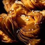 6. Pintar los hojaldres con huevo batido, espolvorearlos con almendra laminada y hornear a 180 ºC durante 20 minutos o hasta que se doren. Dejar enfriar sobre una rejilla.