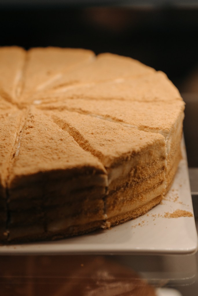 La base de esta tarta está compuesta por obleas, unas galletas finas y crujientes que se utilizan para hacer postres. Estas obleas se intercalan con capas de crema de chocolate, que le dan a la tarta su sabor característico.