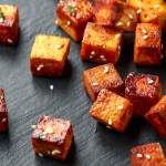 - Saca del frigorífico, ponlo sobre una bandeja de horno con una capa de papel vegetal el tofu bien repartido, lo introduces en el horno a 180 grados durante 15 o 20 minutos.