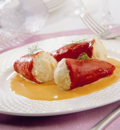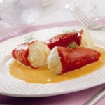 3. Preparamos una fuente con una base de tomate frito y, sobre ella, vamos colocando los pimientos rellenos. Introducimos en el horno a 180ºC hasta que el pimiento esté tierno.