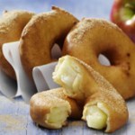 7. Una vez pasado el tiempo de reposo, extender la masa y cortar rectángulos de unos 10 cm de ancho por 20 de largo. Echar parte de las manzanas a lo largo, envolver la masa como un puro y unir las puntas para formar un aro como si de un donut se tratase. Dejar que reposen 20 minutos antes de freírlos.