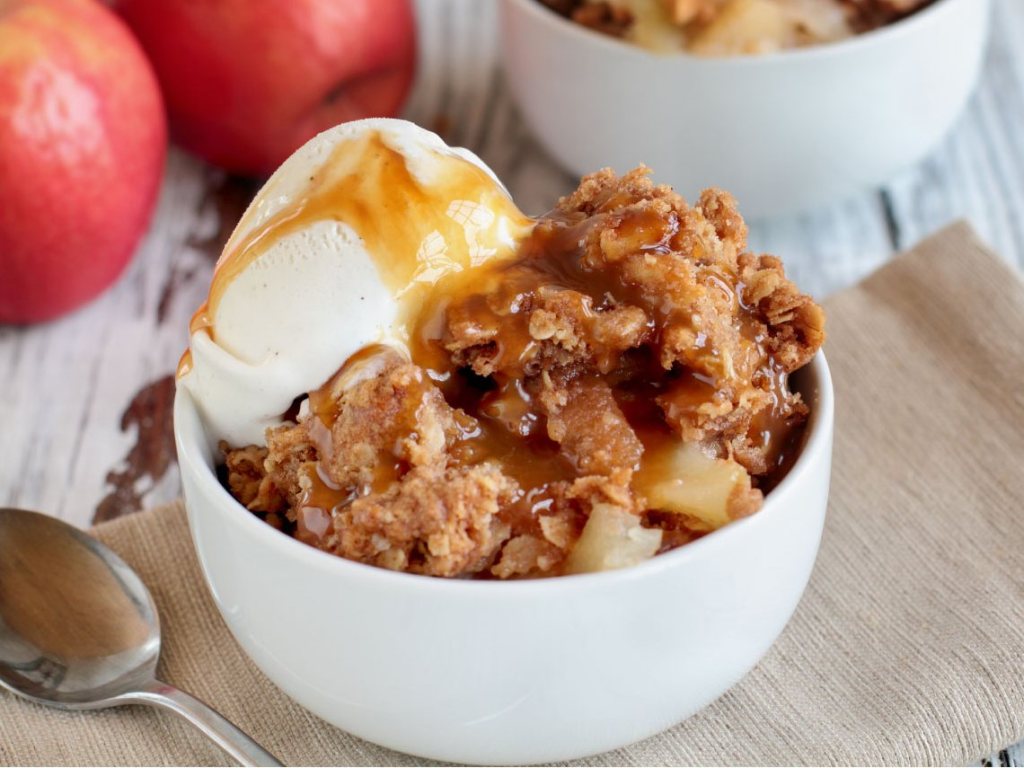 Con la ayuda de una espátula o una cucharada grande, corta y sirve el pudín de manzana tibio, acompañado con una deliciosa bola de helado de vainilla y un chorrito de almíbar.