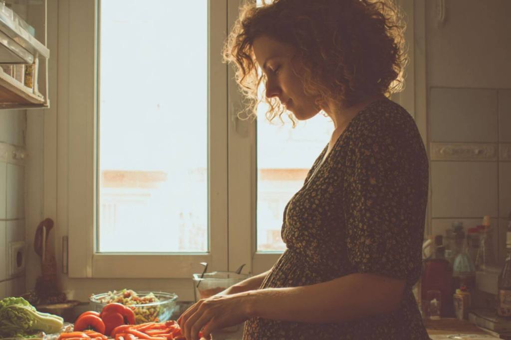 Mujer embarazada cortando verduras en la cocina, símbolo de alimentación equilibrada y saludable en el embarazo.