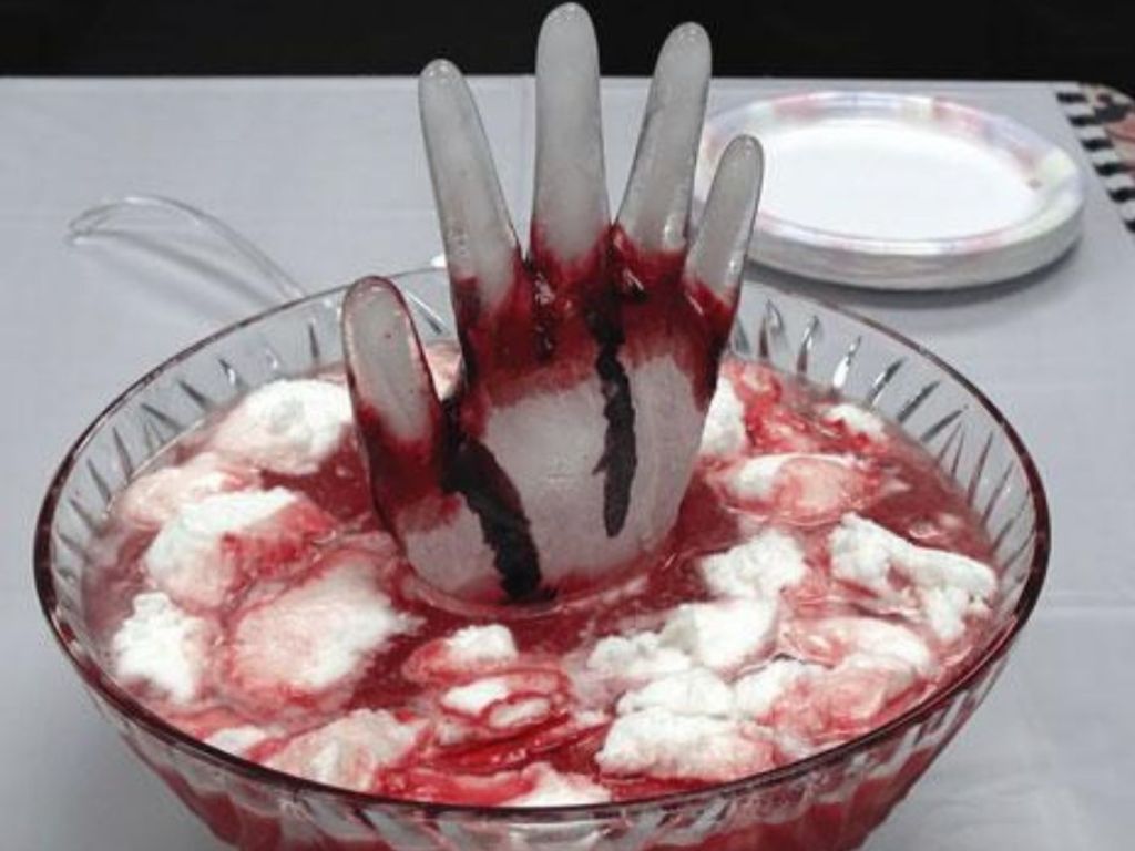 En Halloween puedes servir una sangría normal sin alcohol a la que hay que añadir una mano que sale desde dentro para dar un susto de miedo. Para hacer la mano, meted en el congelador un guante de látex con agua.