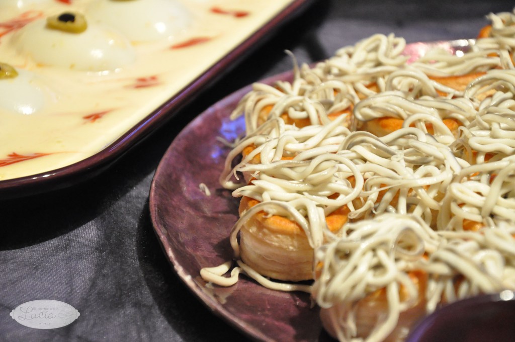 La cena de Halloween puede tener como entrante unos nidos de gusano. Para ello, utiliza unas gulas al estilo clásico, salteadas con ajo y gundilla si te gusta, y colócalas sobre unos hojaldres o base similar. Luego, dales algún toque terrorífico en la decoración.