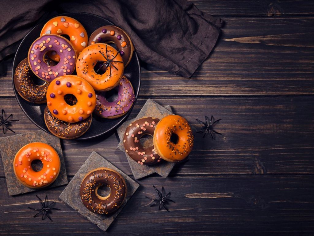 Empezamos con unas deliciosas berlinas decoradas con glaseado de color naranja y chocolate que son perfectas para añadir un toque espeluznante a tu mesa de Halloween. Deja que los peques se lo pasen en grande decorando con virutas de colores y otros productos como los frutos secos muy picados cada una de las berlinas de Halloween.