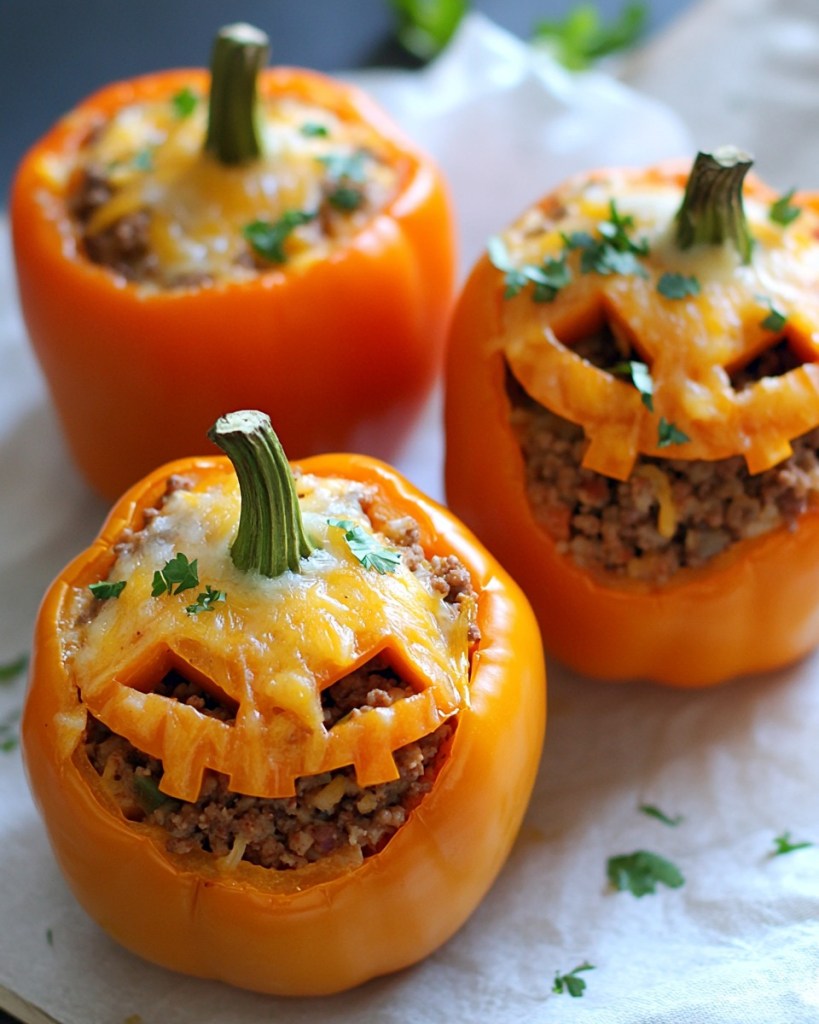 Después, dales un golpe de horno. Ya verás que al hornearlos los pimientos toman un aspecto aún más siniestro, y el relleno jugoso hará que sean un éxito entre los pequeños y los grandes.