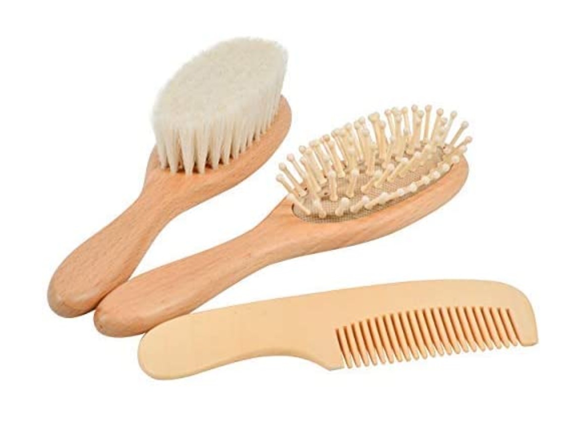 Este set de 3 piezas compuesto por peine y dos cepillos de madera, uno para niños y otro para bebés, es uno de esos regalos geniales para hacer a un recién nacido porque tiene todo lo necesario para su cabello (c.p.v.).