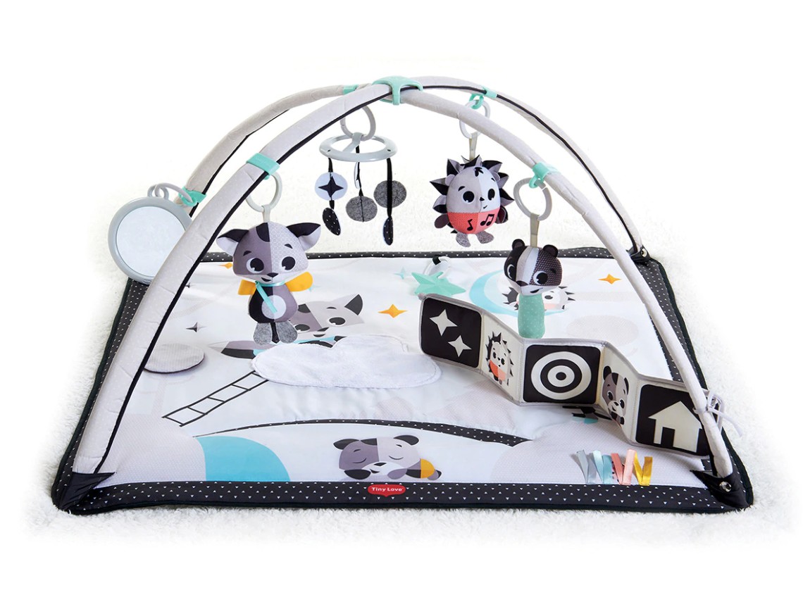 Alfombra de juego infantil en blanco y negro que permite hasta 18 actividades del desarrollo y viene equipada con un libro de tela suave que puede llevarse a cualquier parte. De Tiny Love. Precio: 71,99 euros