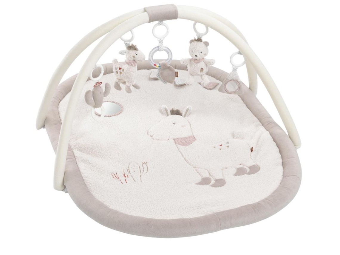 Colcha de actividades de la firma Fehn muy suave con figuras colgantes en los arcos para entrenar el sentido del tacto, la coordinación mano-ojo y fortalecer los músculos de la espalda y el cuello jugando, acostado, gateando y sentándose en diferentes fases de crecimiento. Precio: 54,93 euros