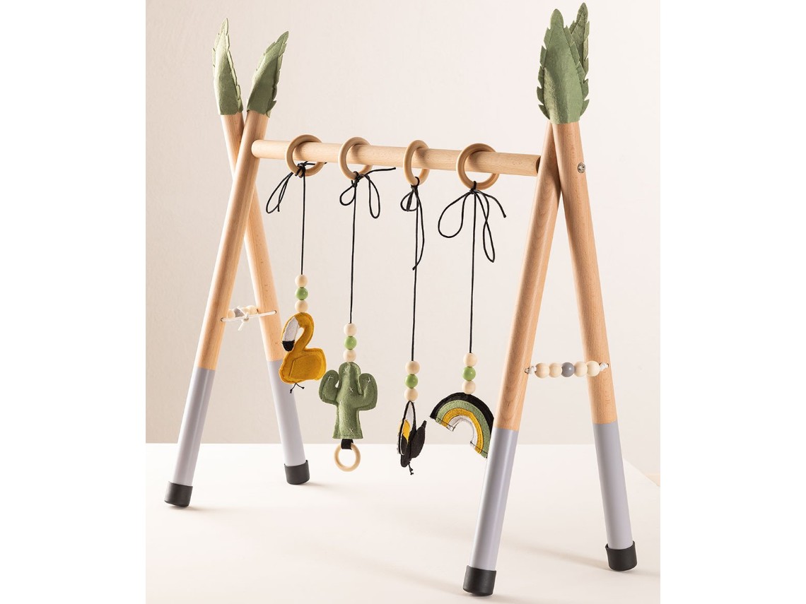 Gimnasio de la firma Zasari Kids fabricado en madera de haya y pintura al agua ecológica, un juguete Ecofriendly que además de ser respetuoso con el medio ambiente ayuda a favorecer el desarrollo cerebral del bebé. Precio: 39,99 euros
