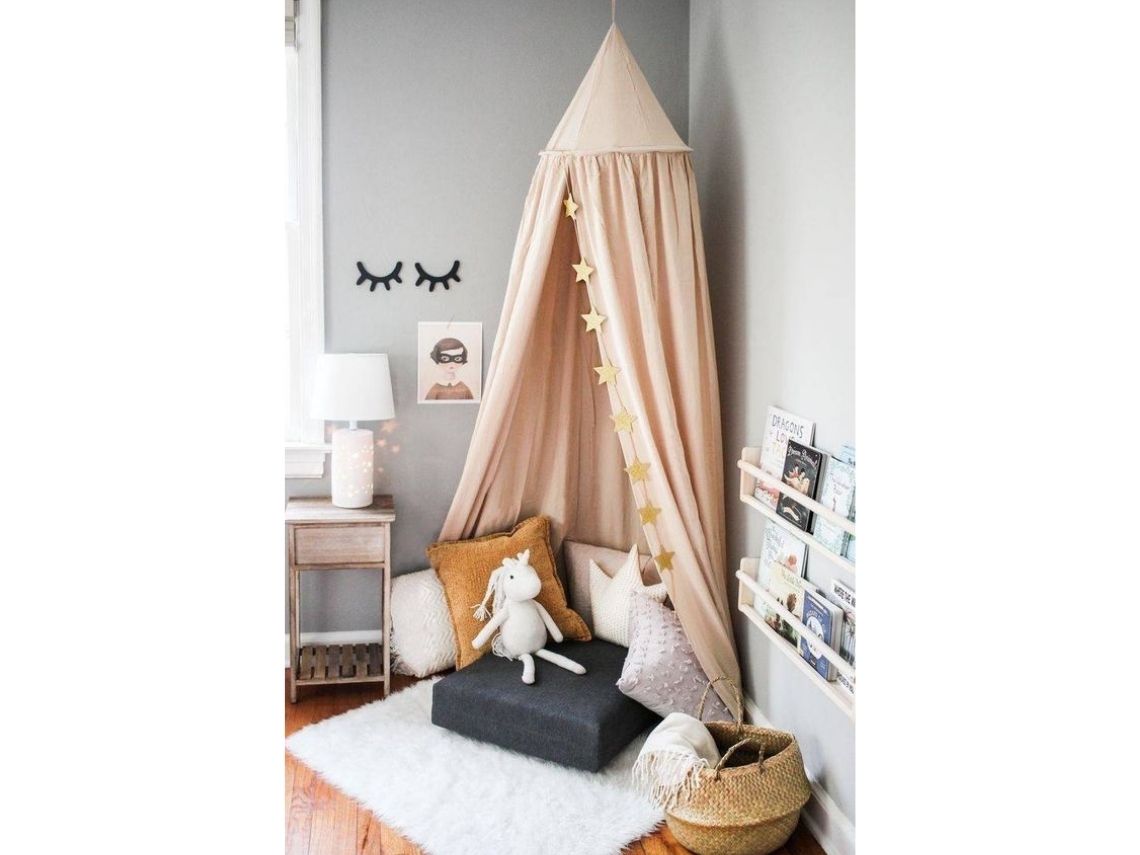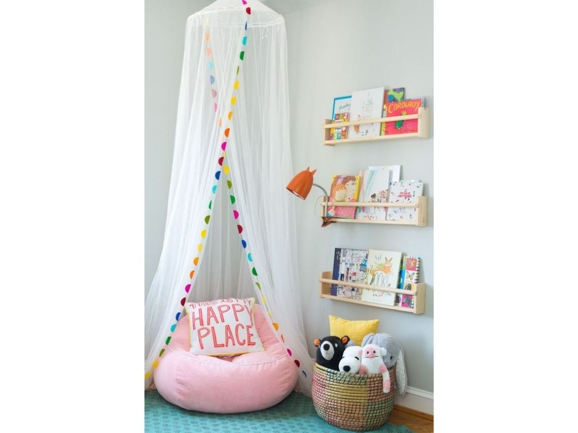 Como comentábamos en el texto, el rincón de lectura debe ser un espacio que llame la atención del niño, para que quiera acudir a él. Este, sin duda, cumple a la perfección con ese tip. ¿Por qué? Porque han incorporado unas cortinas a modo de ‘tipi’ para destacarlo. Además, escogen la opción de puf como asiento y añaden una alfombra en el suelo para aportar calidez.Las estanterías escogidas las encontrarás fácilmente en IKEA y son perfectas porque puedes ponerlas a la altura que consideres.