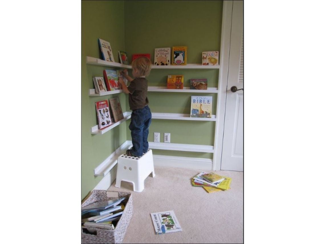 Si queréis que el rincón de lectura dure para siempre podéis tomar ejemplo de aquí: un taburete para que el peque pueda utilizarlo cada vez que quiera alcanzar un libro que está en un sitio muy alto para él (ojo, siempre con supervisión adulta). Para terminar, una alfombra donde echarse a leer y una cesta donde pueda ir dejando todas las lecturas que ya ha ojeado.Después, mamá o papá pasarán a colocar los libros de nuevo en su sitio si él no alcanza.