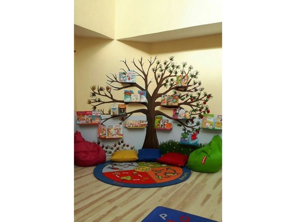 Aunque esta fotografía es de una escuela infantil, podéis tomar inspiración y dibujar en su cuarto un ‘árbol de la lectura’. Puede ser directamente en la pared, o escoger algún papel de decoración con este motivo. En las ramas se camuflarán los estantes con los libros y debajo de él, puf y asientos para disfrutar de la lectura.¡Eso sí! Recuerda que es importante que el árbol no puede ser mucho más grande de la altura del peque.