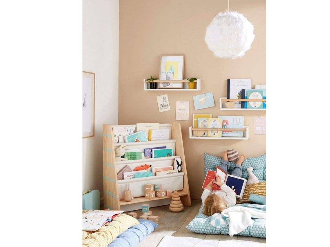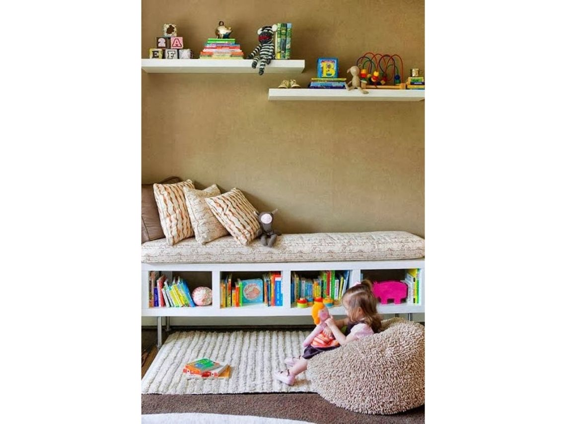 Este mueble es perfecto: arriba una colchoneta para que se siente y abajo todos sus libros con algunos juguetes. ¡No necesitarás más!Puedes incorporar, como en la imagen, un puf y una alfombra para que el peque escoja dónde sentarse.