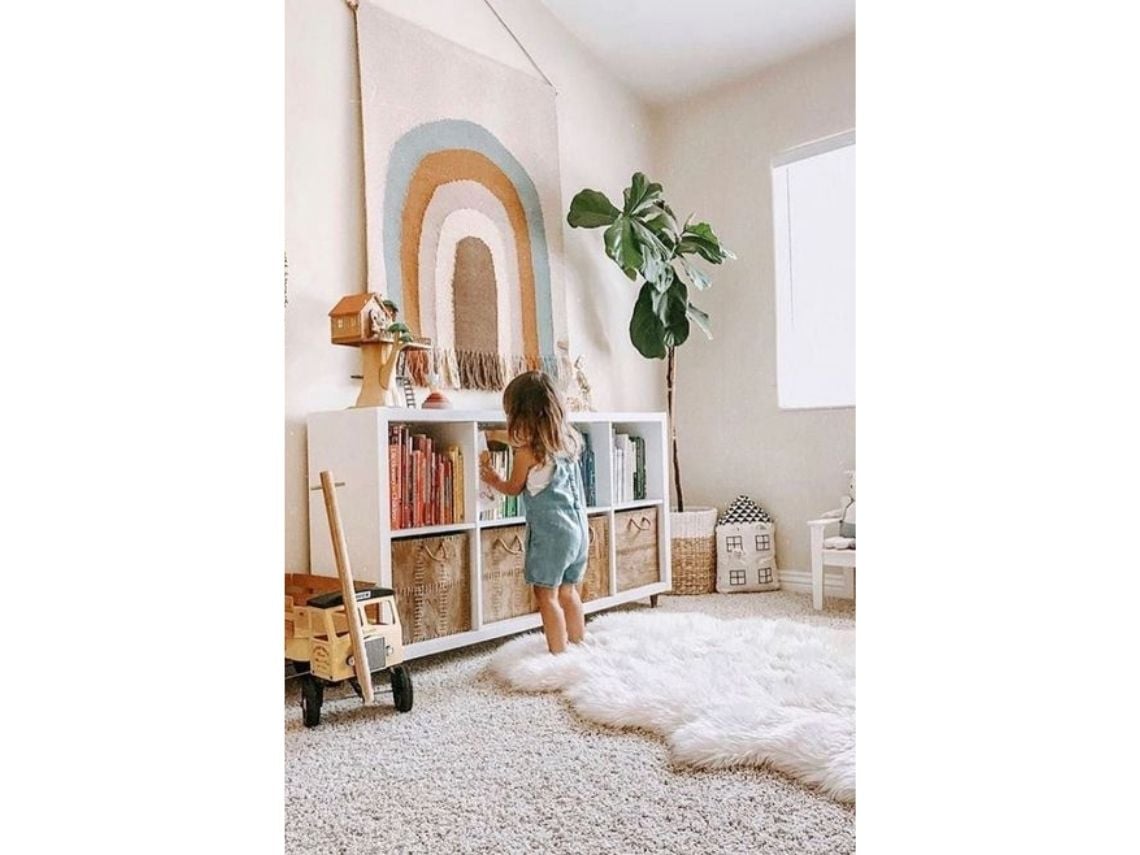 De esta idea lo que más nos gusta es la alfombra: cumple con todos los requisitos para formar parte de un espacio de lectura Montessori. En este caso la estantería es más amplia y, aunque las portadas de los libros no están a la vista del peque, la forma de ordenarlos por colores quizás llame su atención.¿Lo mejor? Incluye juguetes, tanto en las cestas de la parte de debajo de la estantería como a la vista del niño. ¡Será un espacio de juego más!