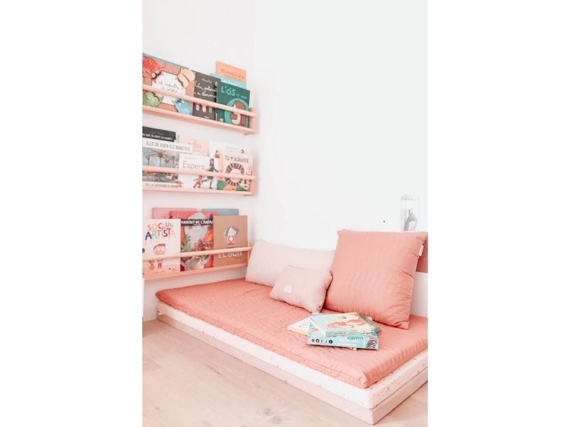 Otra opción es escoger varias colchonetas tipo Montessori para que los peques puedan tumbarse a leer. Lo ideal es poner varias para que estén bien mulliditas y añadir algunos cojines para dar la opción a que se sienten en caso de querer.Igual que en el ejemplo anterior, se han escogido unas estanterías de IKEA que podrás poner a la altura que mejor os venta.En cuanto al espacio, en este caso se ha optado por habilitar una esquina de la casa.