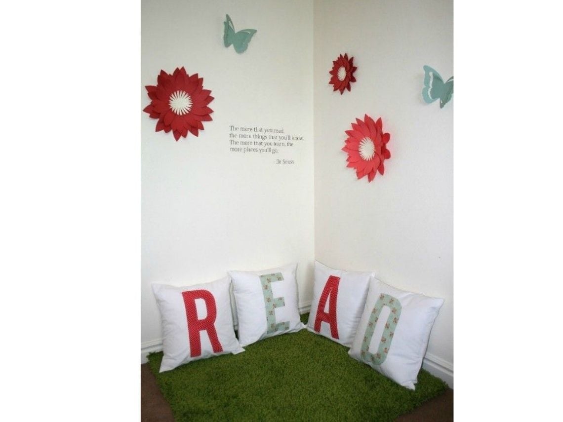Este ejemplo es tan sencillo que nos encanta: varios cojines, un trozo de césped artificial bien gordito y una cita literaria en la pared. ¡Es perfecto!
